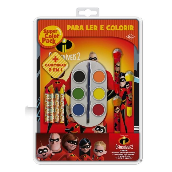 Os Incríveis, a família mais heroica do mundo Disney, te convida para a diversão. O blister inclui livro para ler e colorir, gizes de cera, paleta de aquarela e canetinhas com carimbos acoplados.